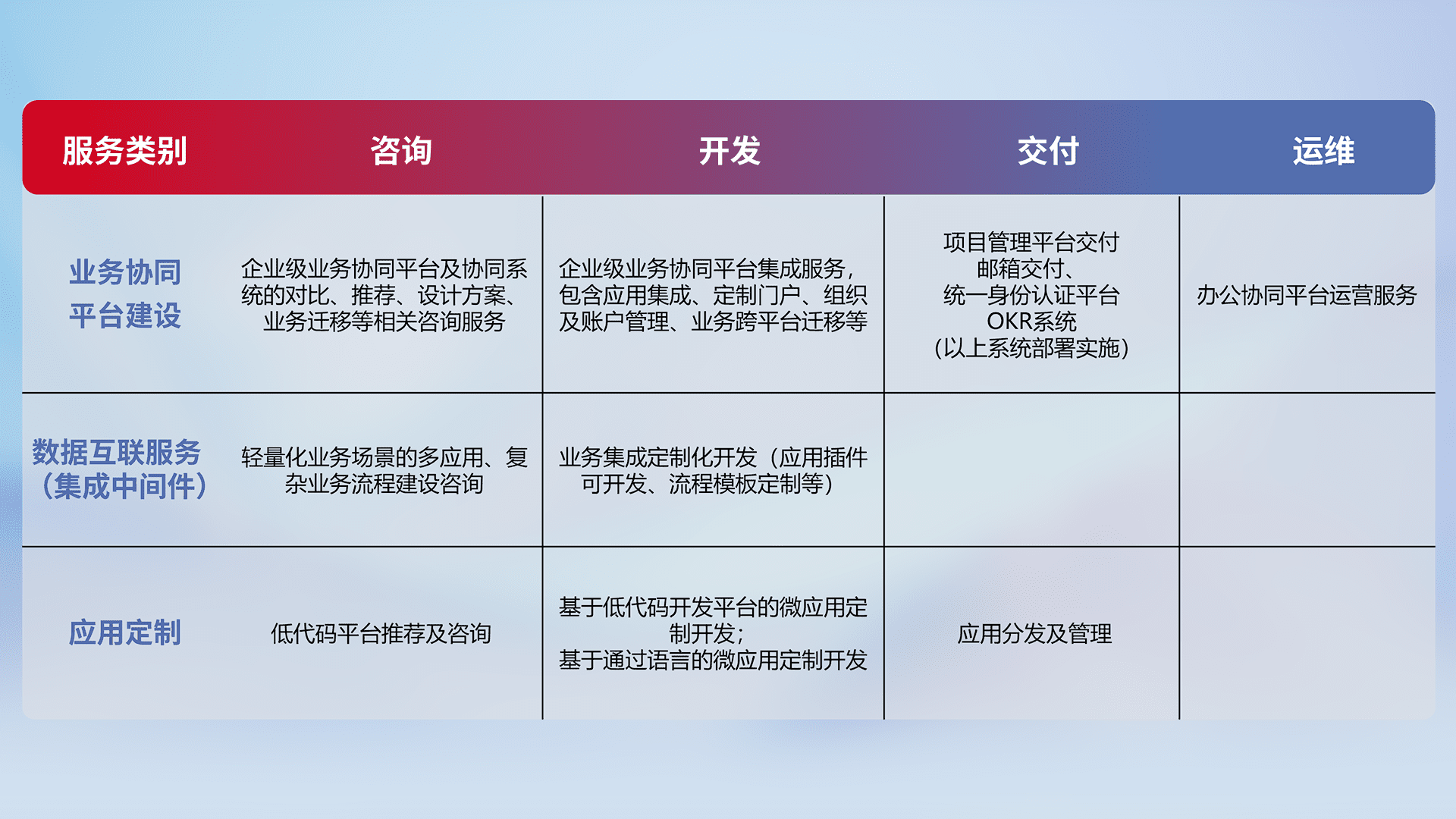 针对钉钉、、企微、、、、IDaas等平台级产品提供产品的规划、、、、方案、、、、交付、、、定制化开发等服务,,,实现如统一协同办公、、、、智能客户服务、、、混合会议管理、、、、智能数据查询、、等业务场景,,实现数字化转型。。。。