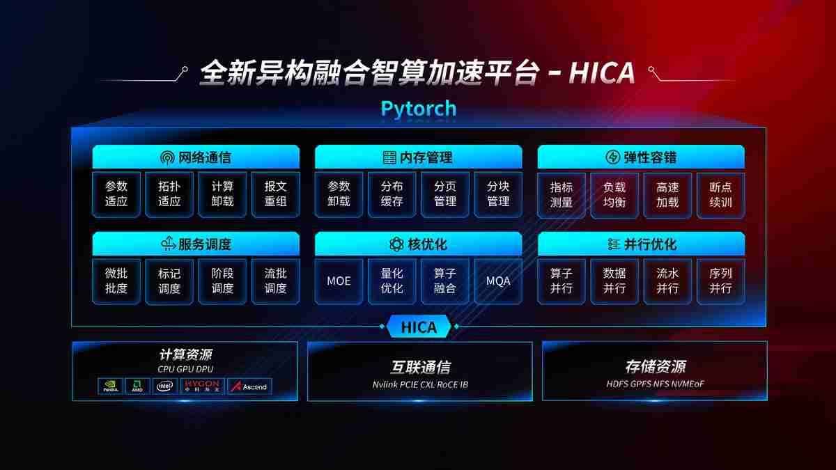 通过自研的服务层、、、、中间适配层、、以及调度编排算法,,采用数据并行、、、、模型并行等多种并行方式,,,把并行计算任务进行有效的分解,,使其分别由相应的软件栈和算力资源来承接。。。当GPU资源变化,,HICA可以实时动态调度计算子任务并调整模型拓扑和架构,,,,以充分聚合各种算力资源。。。。
