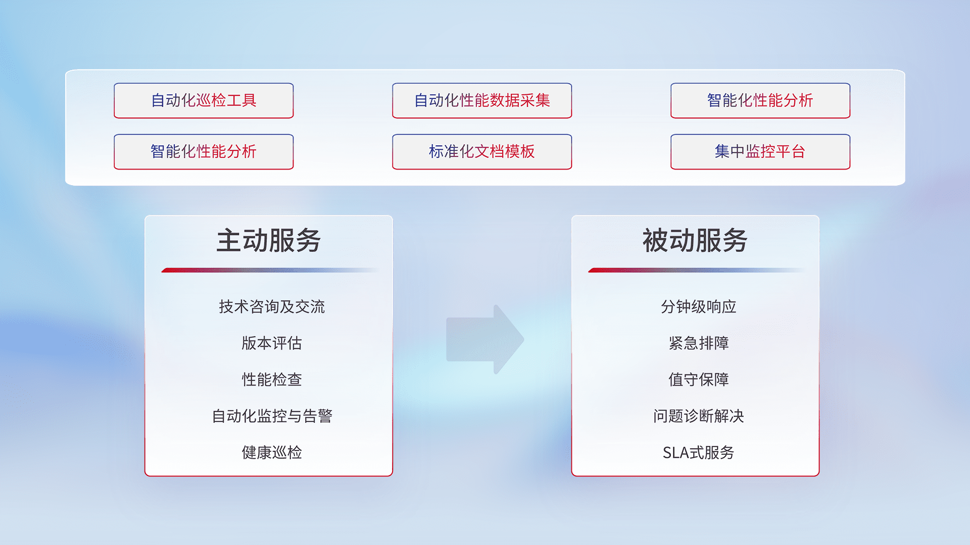 智能化工具和标准化文档,,保障服务质量,,提供主动服务(包含技术咨询、、、、版本评估、、、、性能检查、、、、自动化监控与告警、、、、健康巡检)和被动服务包含(分钟级响应、、紧急排障、、值守保障、、、、问题诊断解决、、、SLA服务)。。。